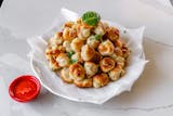 A classic snack, our garlic knots are strips of pizza dough tied in a knot, baked, and then topped with melted butter, garlic, and parsley. Served with a side of sauce.